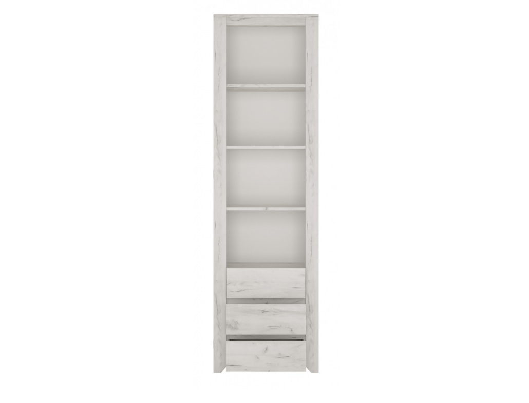 Nyitott polcos három fiókos szekrény.