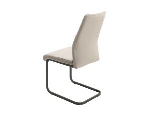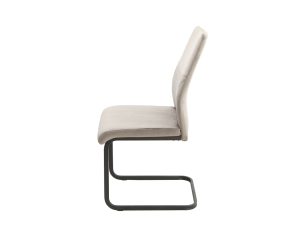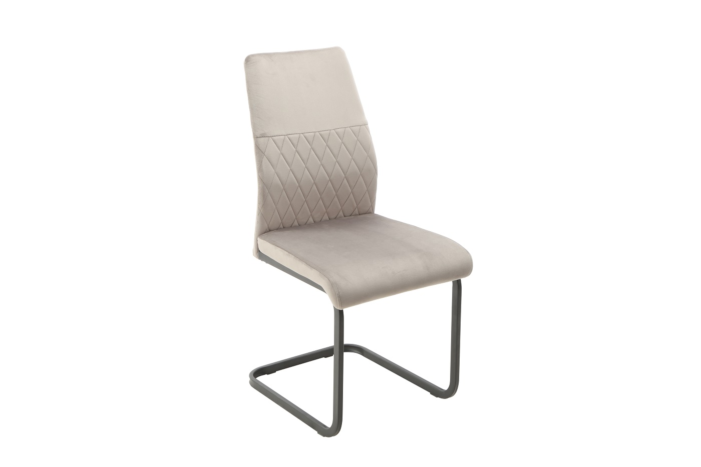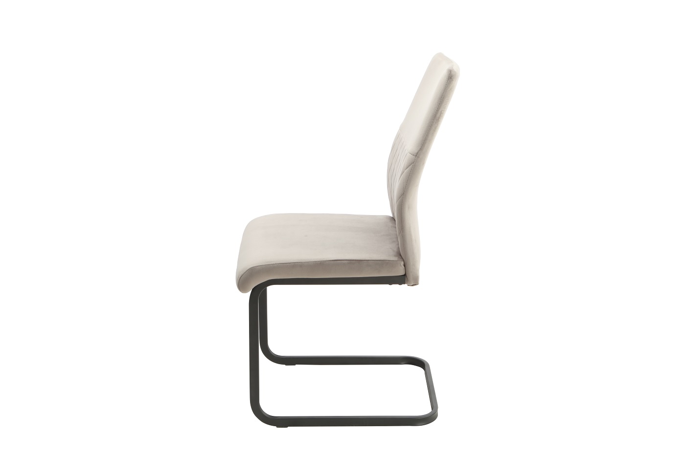 Hajlított, festett fekete fém lábbal; szürke bársony kárpitozással.