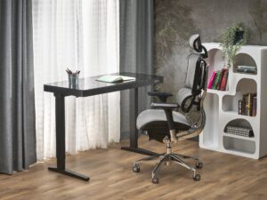 méretek: 120/60/77-120 cm; állítható magasságú íróasztal / érintésvezérlő gombok / vezeték nélküli töltés / USB, anyag: üveg / porfestett acél, szín: fekete