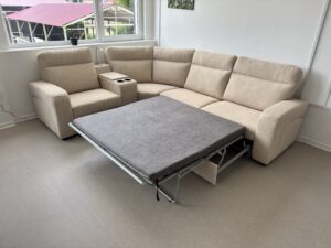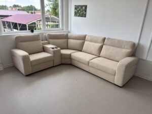 Többféle karfaopció érhető el hozzá, köztük tárolós, beépített lámpával és USB töltővel felszerelt, illetve kiemelhető kis asztalkás változat is. A kanapé előrefelé nyitható, ágyazható kialakítású, így gyorsan és egyszerűen alakítható át kényelmes fekvőfelületté vendégek számára. A beépített ágyneműtartó praktikus tárolóhelyet kínál a mindennapokban. Opcionálisan lábtartós változatban is rendelhető, amely tovább fokozza a komfortot.