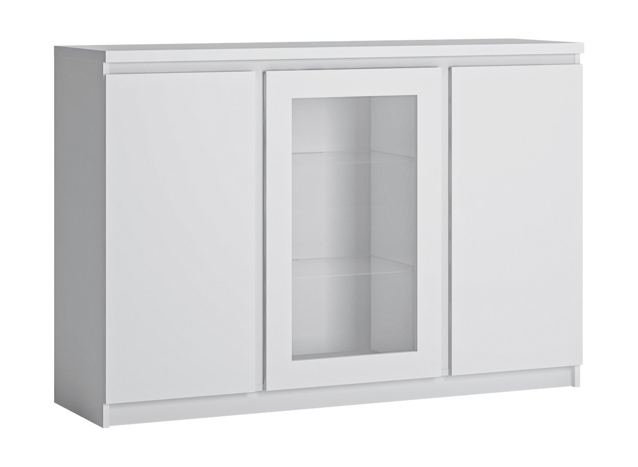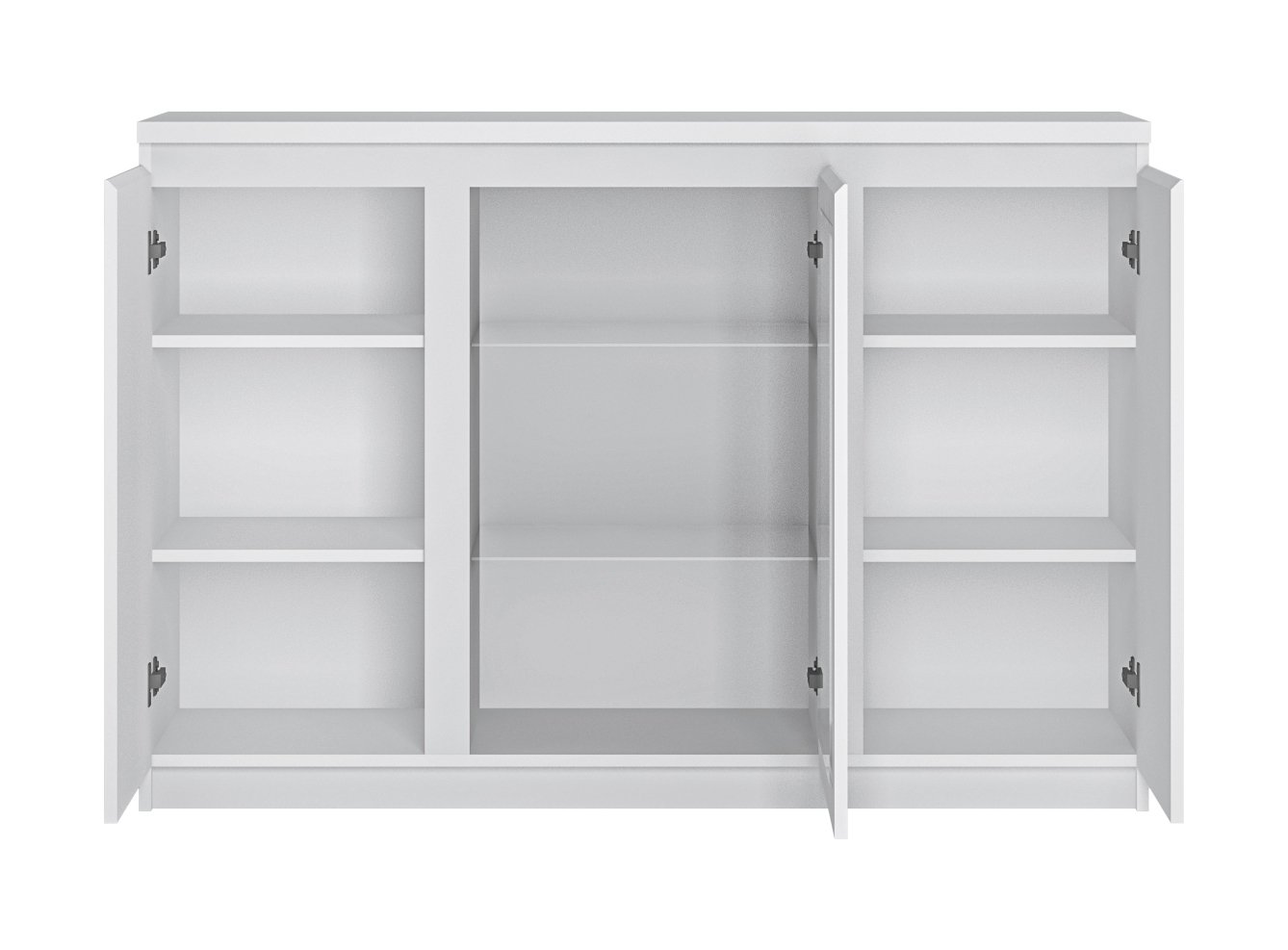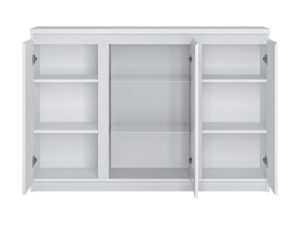 innovatív üveg előlappal ellátott komód, a képen látható belső elrendezéssel, három ajtóval rendelkezik