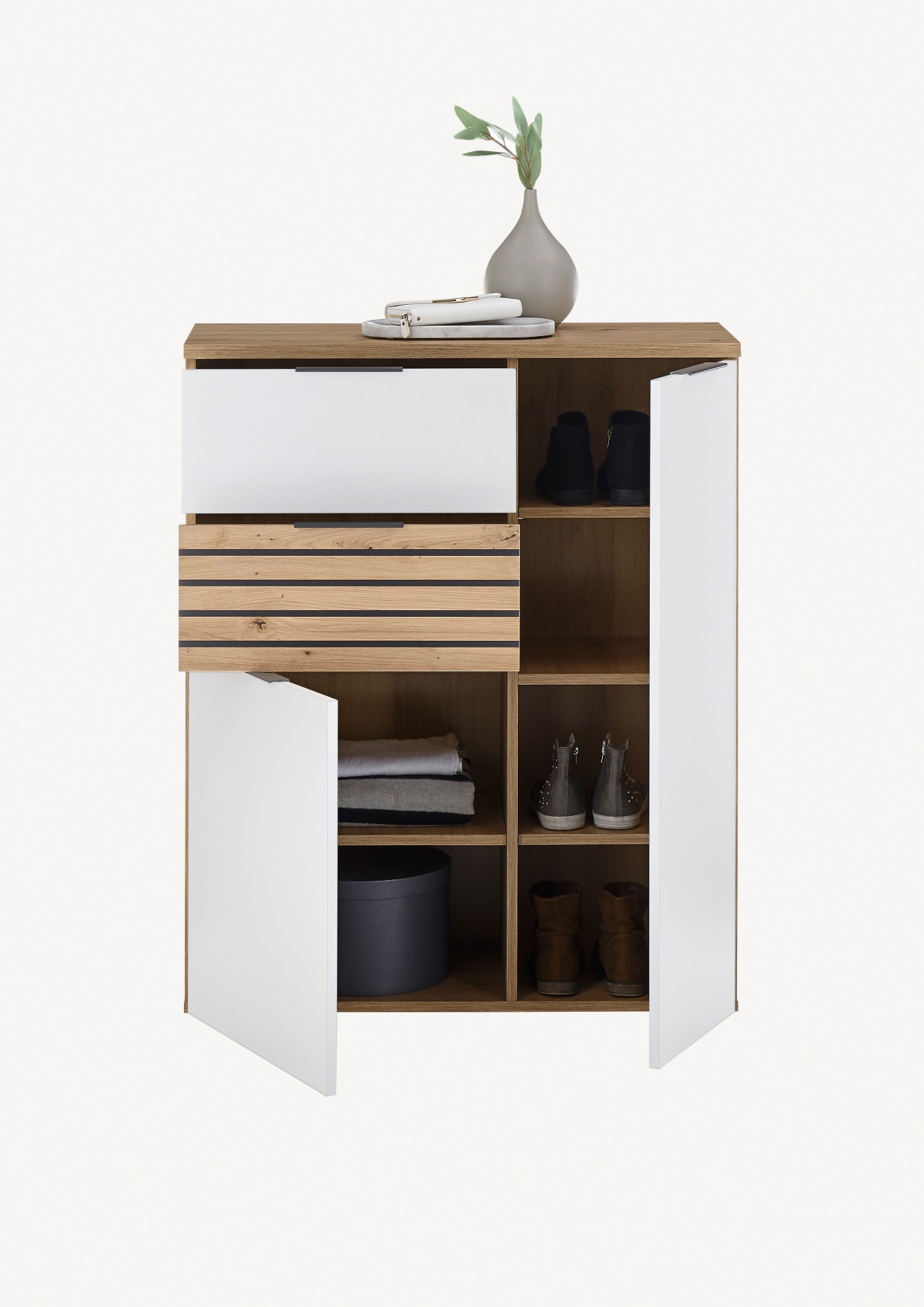 Két ajtós, két fiókos cipősszekrény Artisan tölgy/fehér színben.