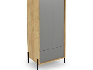 méretek: 78/60/179 cm, anyag: 18 mm vastag furnérozott bútorlap / absz élek / push-click nyitórendszer, szín: test – natúr hickory, frontok – poros szürke
