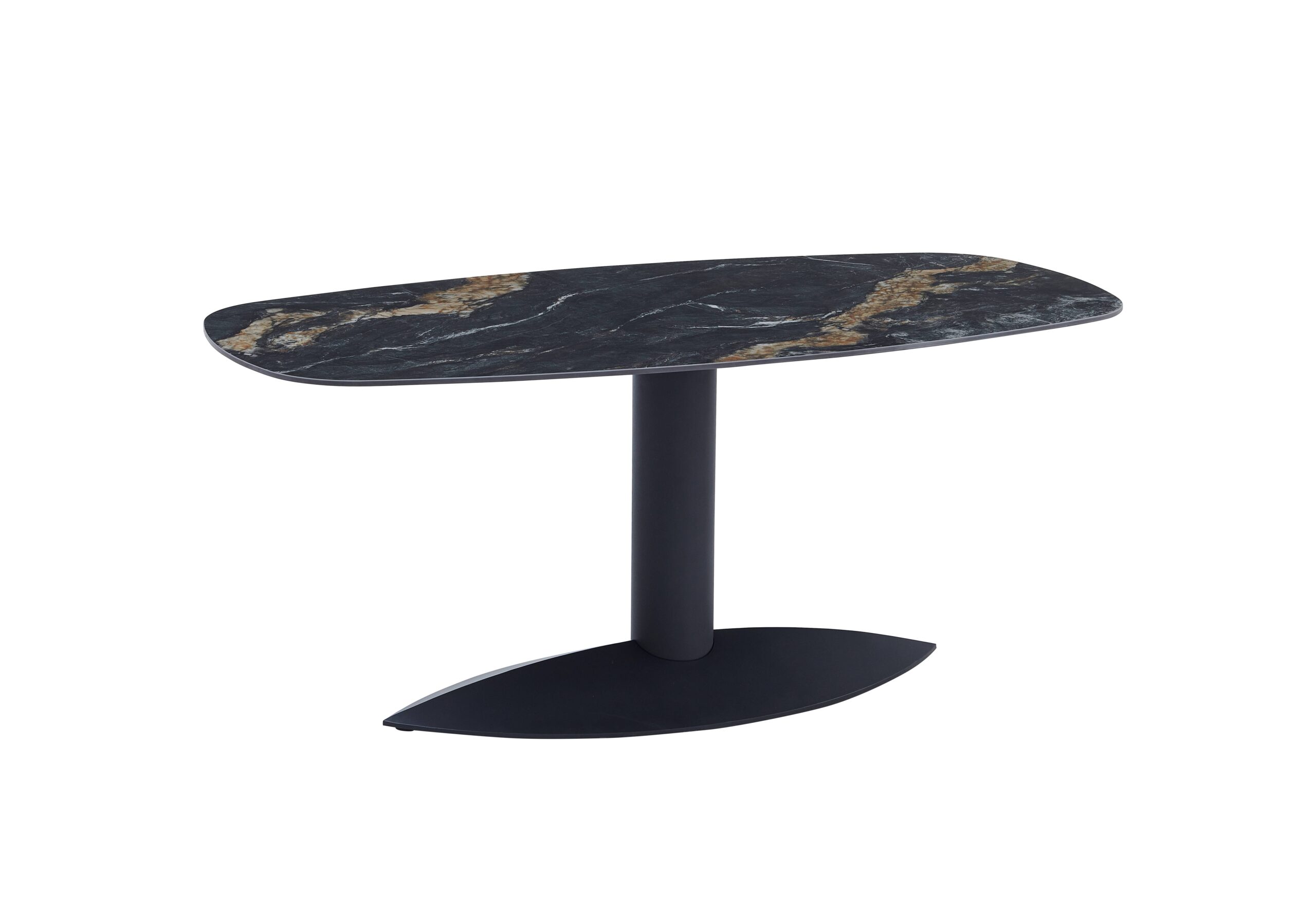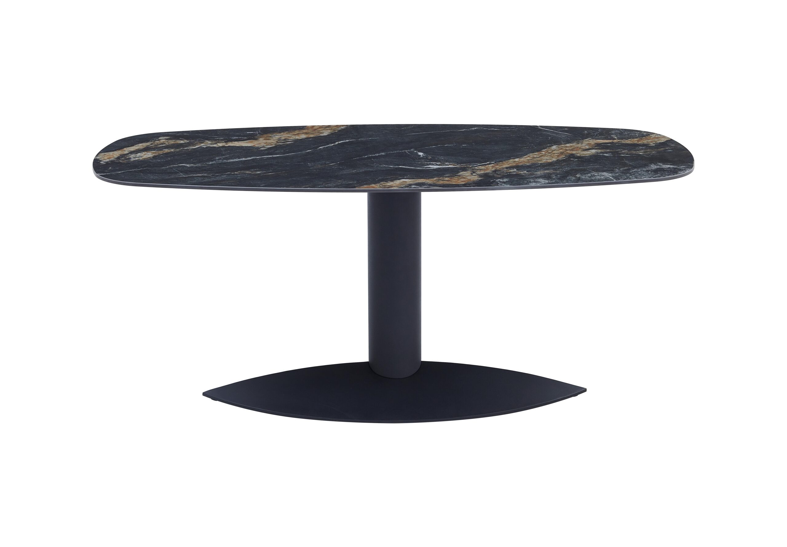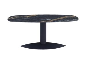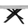 Szinterezett kő étkezőasztal, porszórt fekete fém lábbal és bázissal a képen látható asztallap mintával.