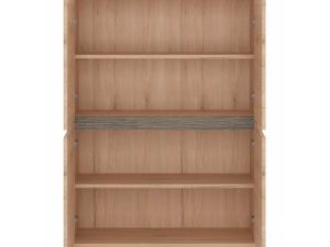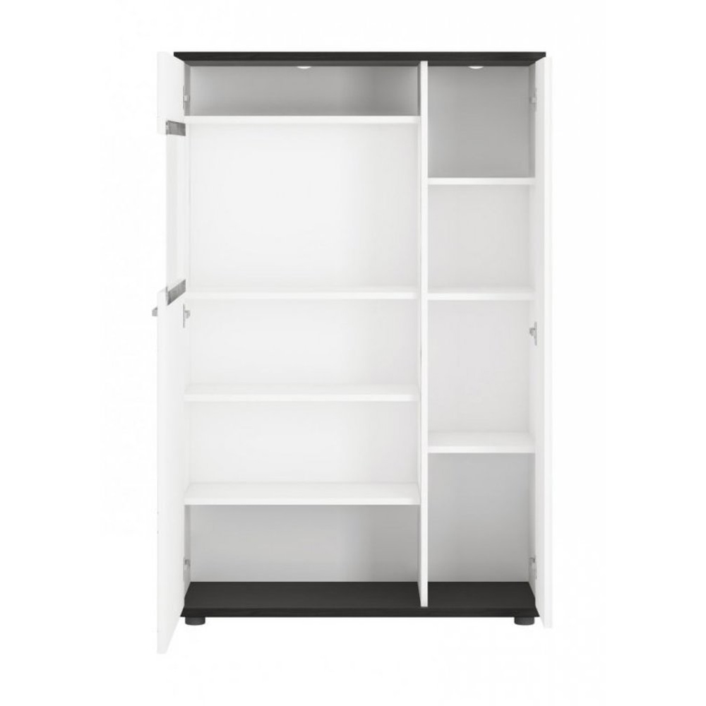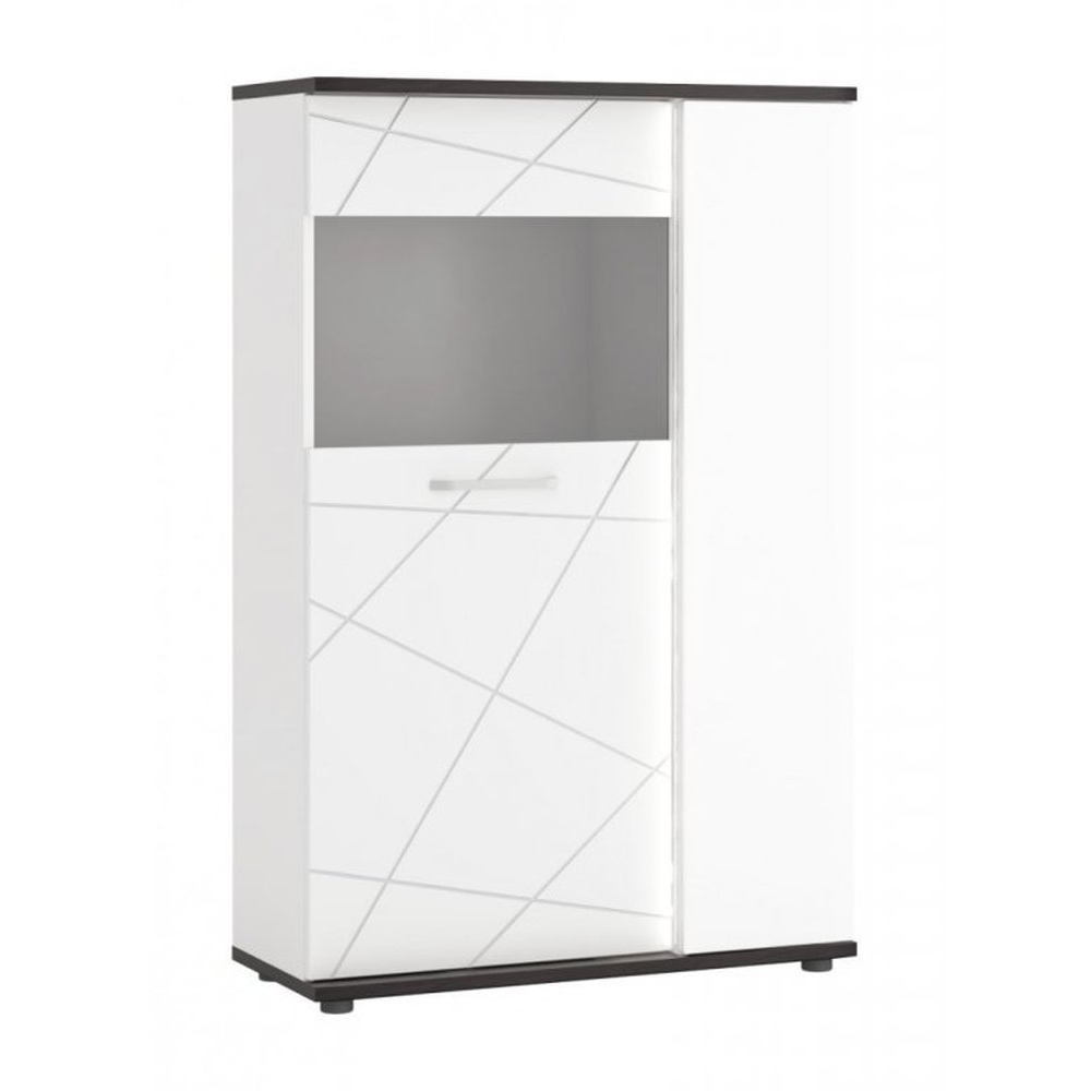 A Venezia kollekció stílusos bútora laminált forgácslapból (test) és magasfényű MDF lapból (előlapok) készült. A fehér vitrin szekrény Vicenza tölgy árnyalatú fekete betétekkel rendelkezik.