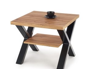 méretek: 65/65/55 cm, anyag: lap – laminált forgácslap, szélein ABS műanyag, lábak – porszórt acél, szín: lap – tölgyfa, lábak – fekete.